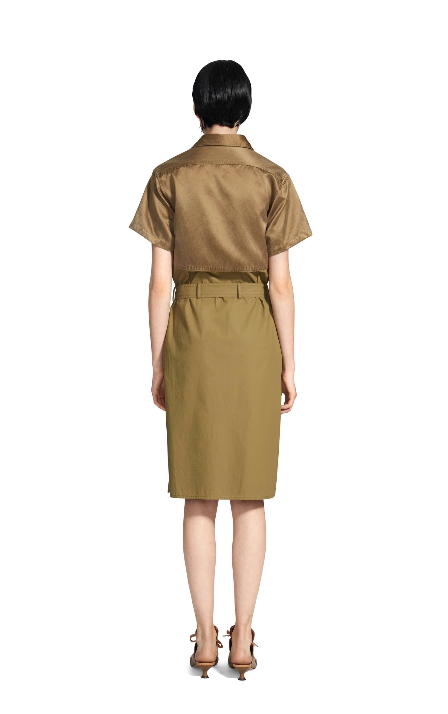 Mid length collared button down dress. Self belt at waist. Paneled dress. Top composed of a soft viscose satin fabric. Skirt of the dress composed of cotton poplin. Enzyme-washed to for a soft feel.